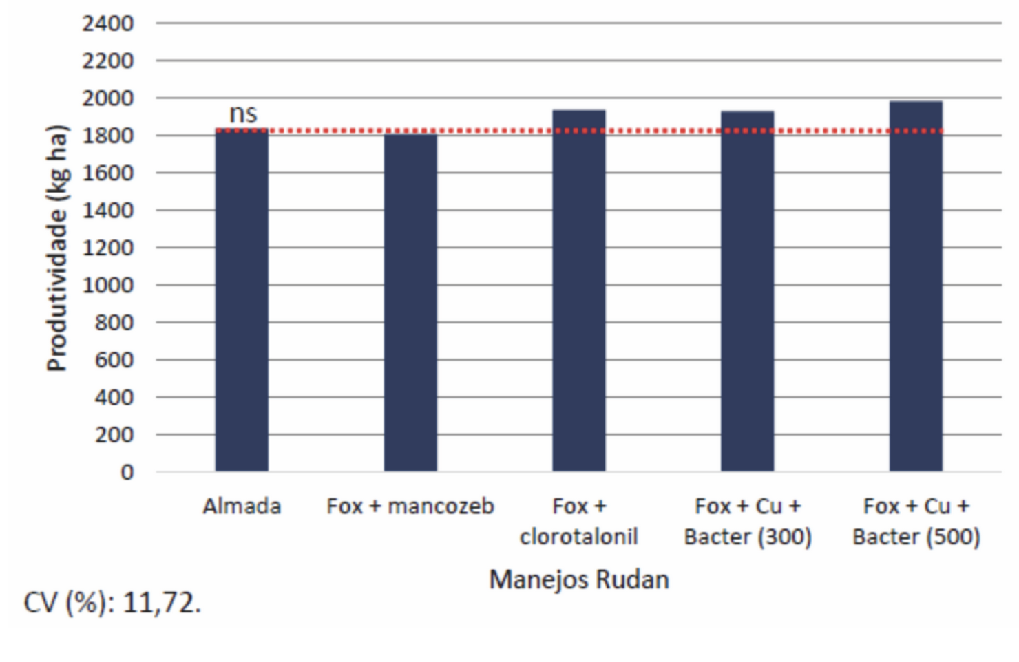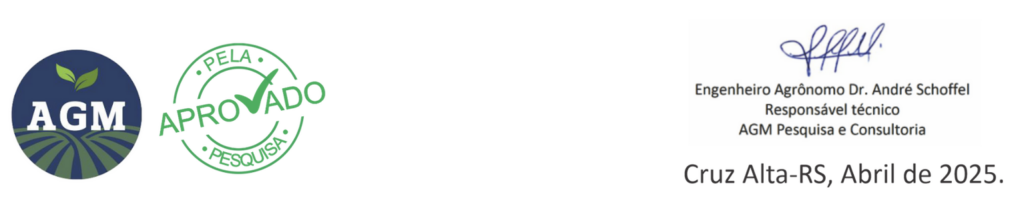 Os tratamentos que receberam manejo Rudan destacaram-se em valores absolutos. Neste contexto, apesarda ausência de diferença significativa, o manejo que recebeu Fox + Cobre Plus (300 ml ha-1) + Bacter10 (500 ml ha-1) apresentou produtividade de 1.984 kg ha-1 e o manejo padrão obteve média de  1.840 kg ha-1, com diferença de 2,4 sacas ha-1.Na safra 2024/25, foi possível verificar o incremento na produtividade em um safra que recebeu aproximadamente 200 mm de chuva durante o ciclo produtivo, e destes, apenas 130 mm na fase reprodutiva.